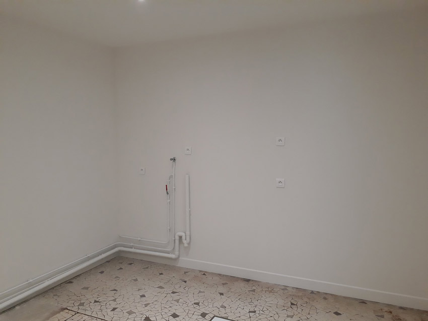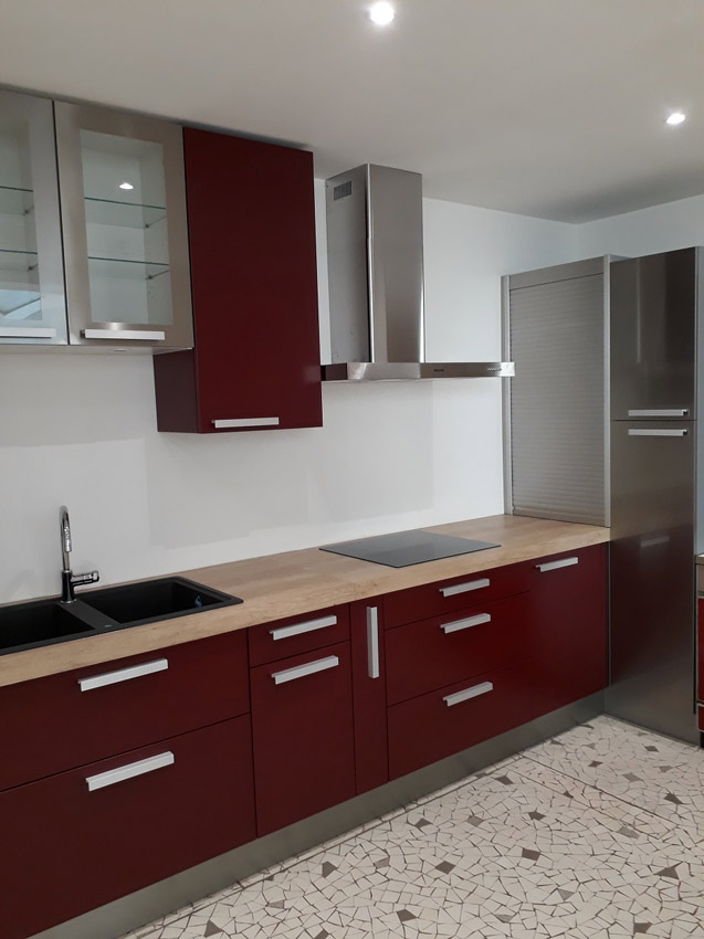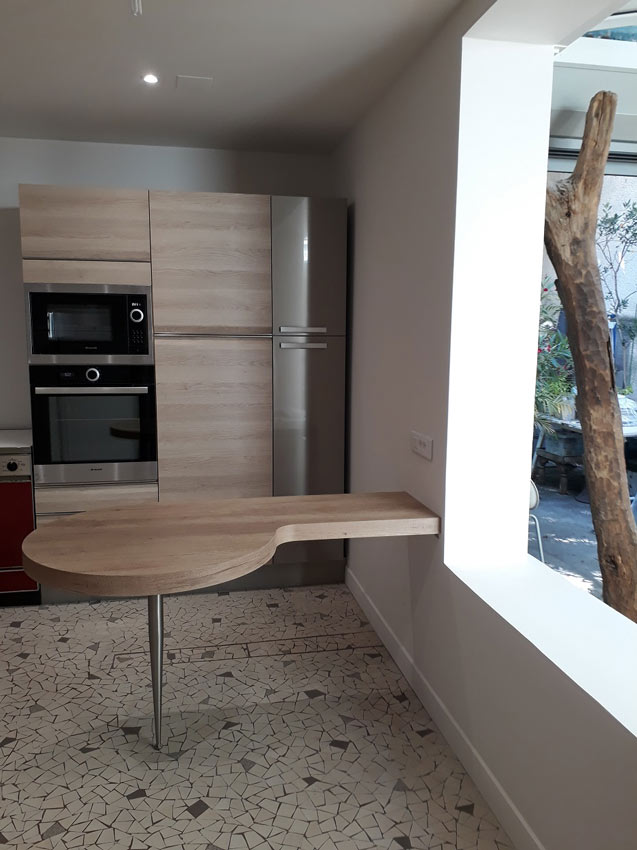 La cuisine a été repensée, rénovée et remplacée en alliant la sobriété du bois blanchi et de l’inox avec la couleur pour un look intemporel à Montreuil en juillet 2018.