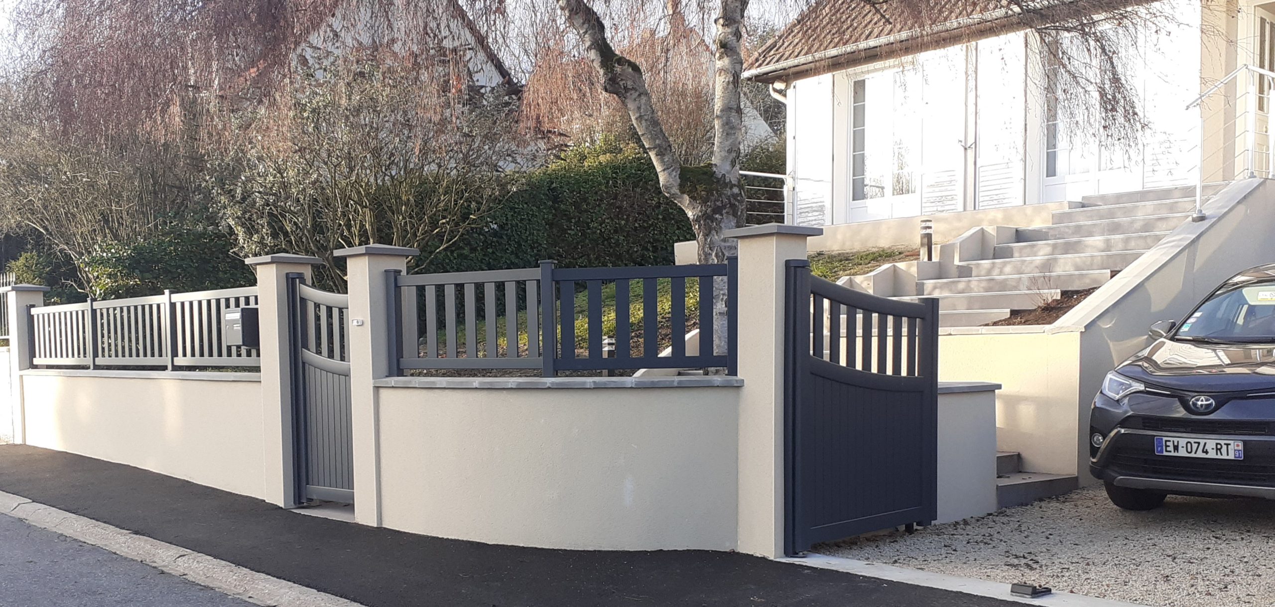Pour réduire l’emprise au sol et simplifier l’entretien, la haie de laurier a été substituée par un muret enduit et une cloture (travées) en aluminium. À Nozay en juin 2023
