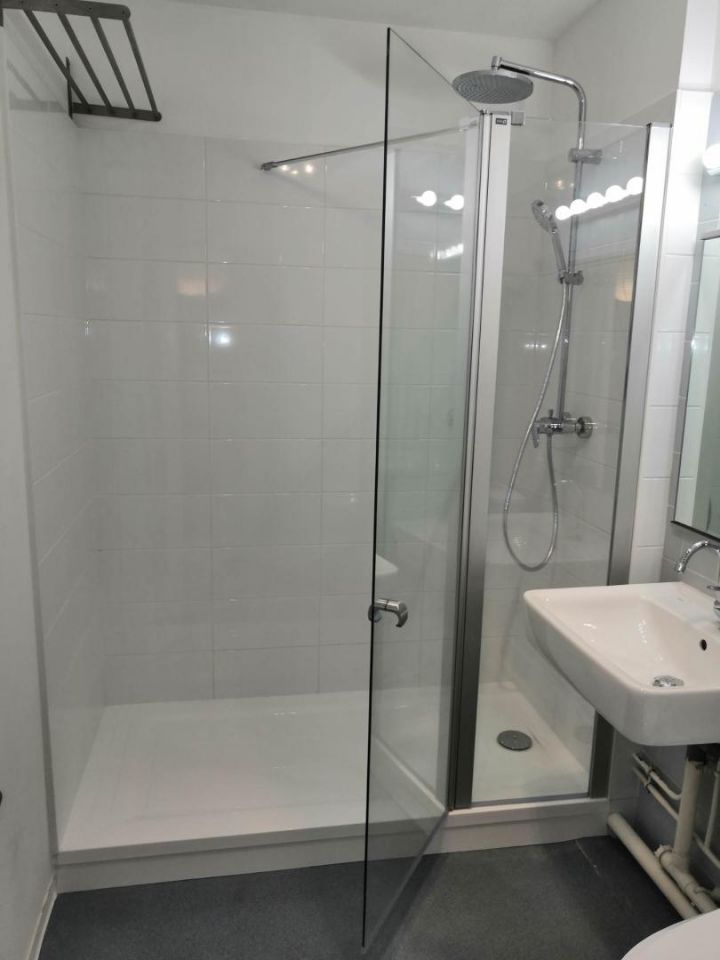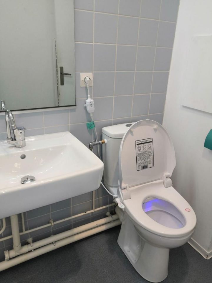 La baignoire a été transformée en douche. Elle est équipée d’une porte de douche réalisée sur-mesure, qui permet à l’assistante de vie d’intervenir si nécessaire durant la douche. Les mitigeurs et le WC sont adaptés au handicap du client.