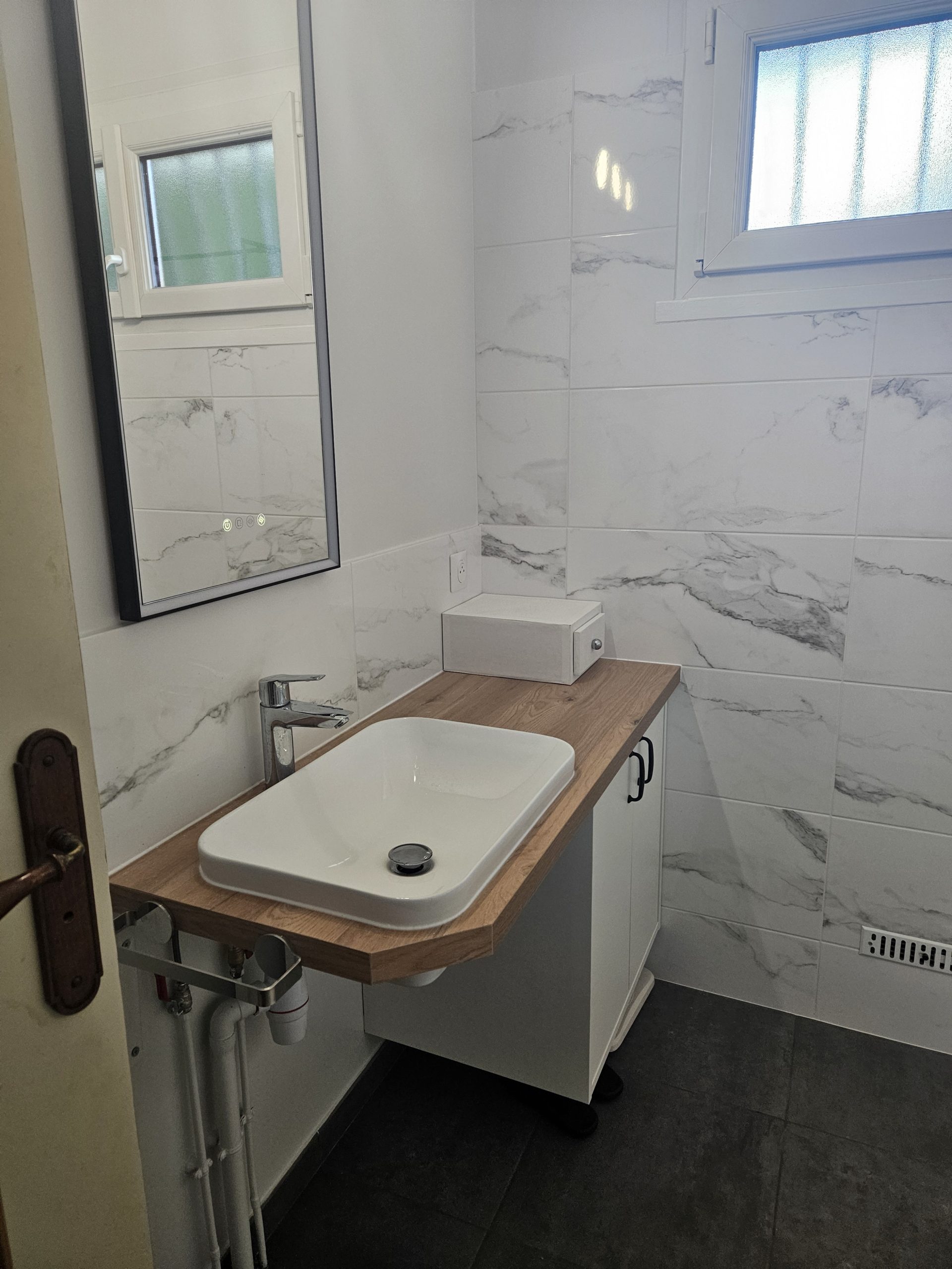 Un meuble vasque permettant l’accès avec un fauteuil roulant a également remplacé l’ancien lavabo.