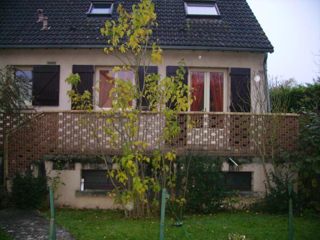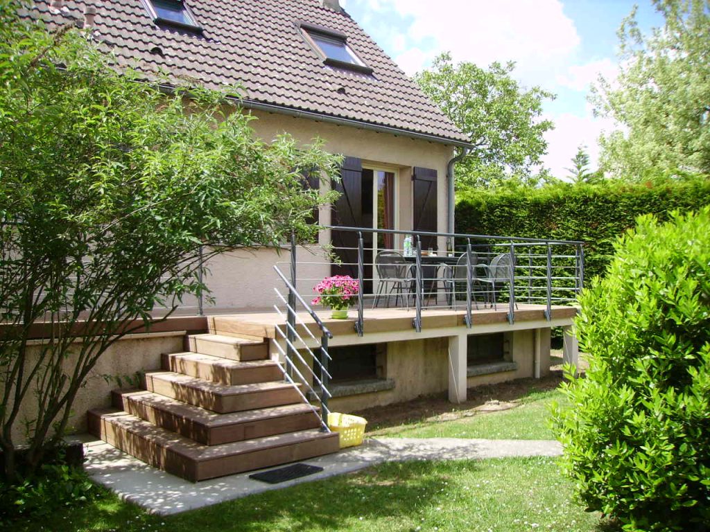 Agrandissement d’une terrasse par une structure en ossature bois recouverte d’IPE, implantation d’un escalier d’accés au jardin, mai 2012 à Marolles en Hurepoix