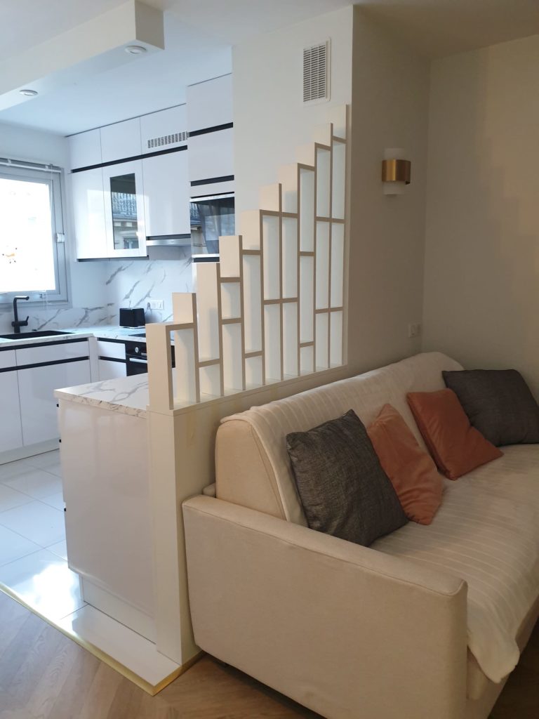 A Paris, cet F2 de 1970 encore aménagé d’origine a été repensé et redécoré. Adieu les petites pièces (cuisine, entrée, couloir…), place à un espace de vie décloisonné mais structuré et baigné de lumière. Ce projet a été mené avec notre partenaire AUTEURS INTERIEURS Mme Hanan SALLOUM à Plaisir. A l’automne 2023.