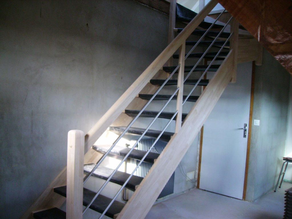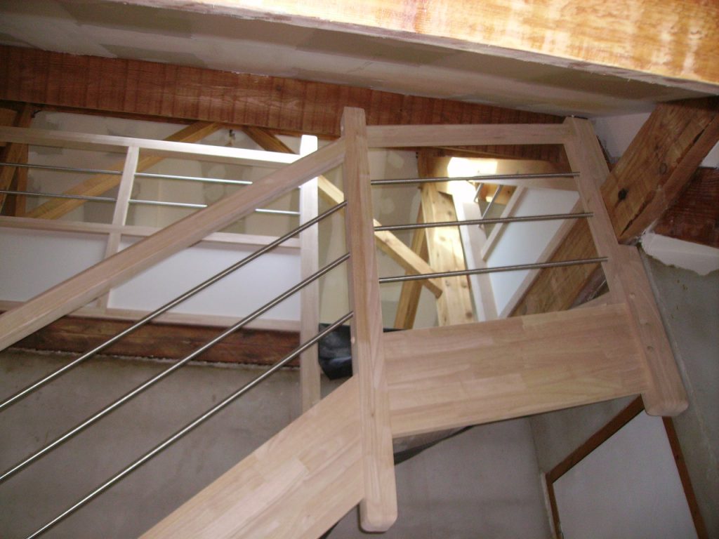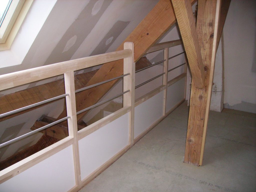 Création d’un escalier sur mesure avec son garde corps contemporain et aménagement de la pointe de combles pour créer une salle de jeux, Mai 2012 à Morangis