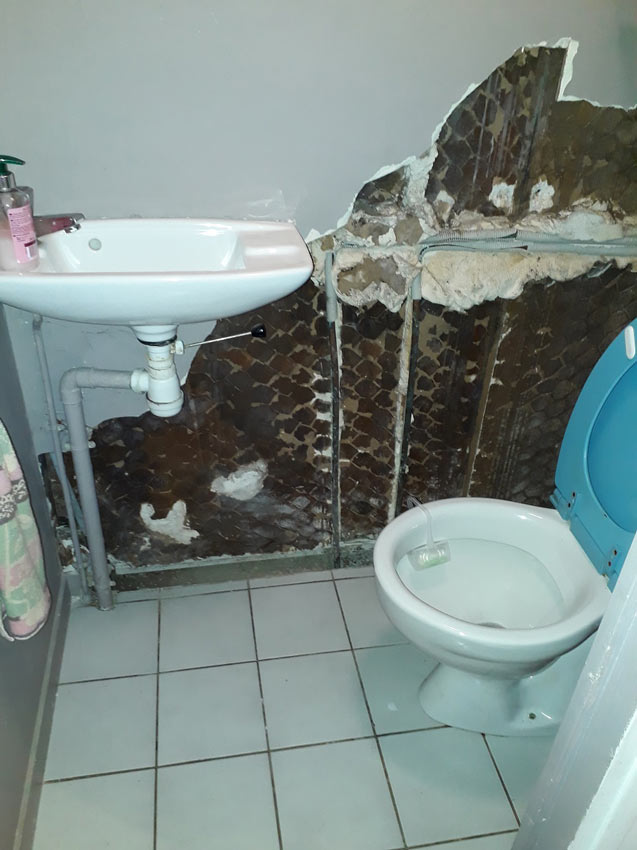 Le bac à douche de cette salle d’eau était en “acrylique” et installée de manière non-conforme et non-étanche. Les infiltrations en résultant avaient détérioré le WC et la cage d’escalier adjacent.
