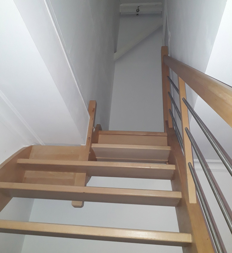 Nos clients souhaitaient pouvoir utiliser cette chambre au quotidien. Nous avons étudié plusieurs solutions techniques pour créer un nouvel escalier confortable et avoir une circulation logique dans la maison. Une nouvelle trémie a été créée et un escalier 1/8 tournant bas en hêtre avec un garde-corps contemporain démontable positionné.