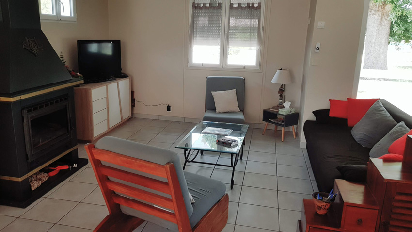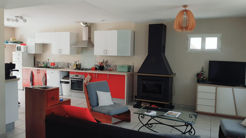 Ils sont maintenant à proximité ce qui permet de limiter les déplacements. Le coin repas est au sud pour pouvoir profiter de la nouvelle baie vitrée et de la vue. Le salon a été récrée à leur place, c’est devenu un espace cosy ou l’on peut se réfugier au coin du poêle.