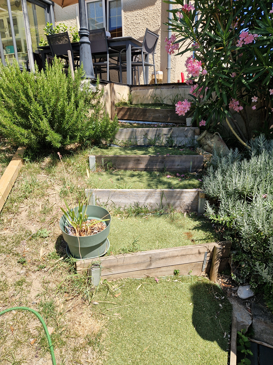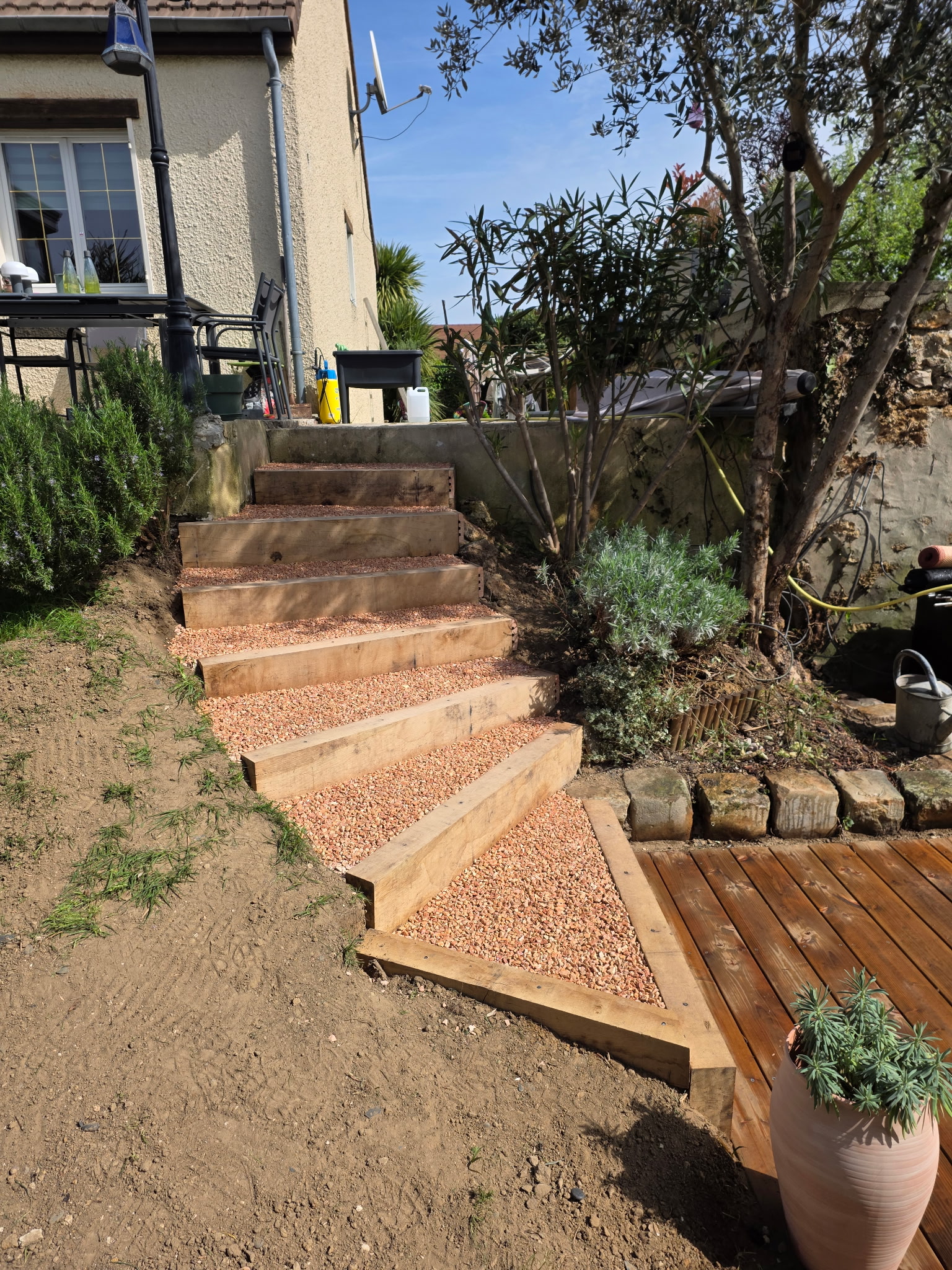 L’escalier a été réalisé avec des traverses paysagères associées à des graviers blancs calcaires. Cette solution offre un rendu naturel, stable et parfaitement intégré au jardin. Les marches sont plus confortables à l’usage et facilitent les déplacements autour de la piscine.