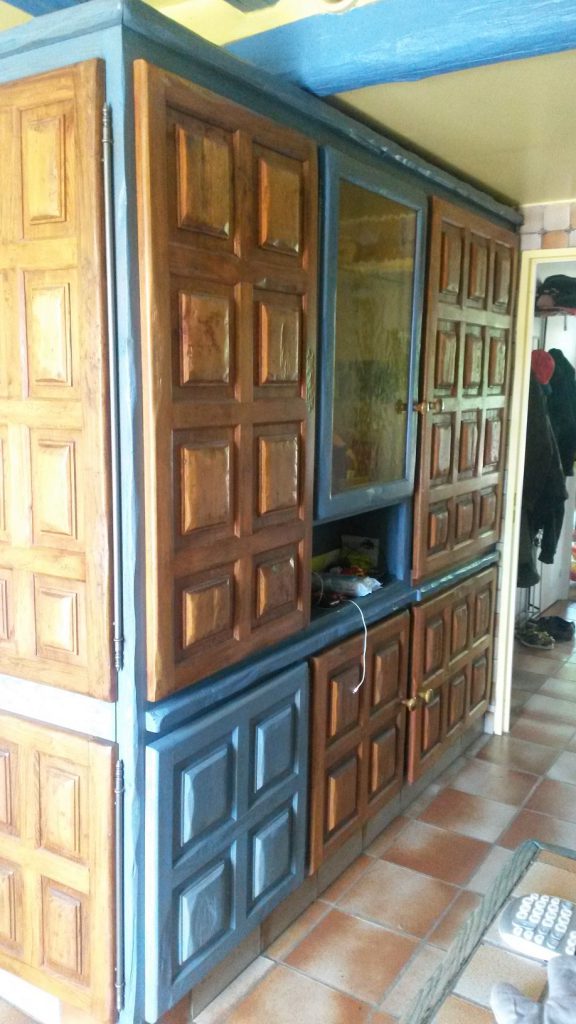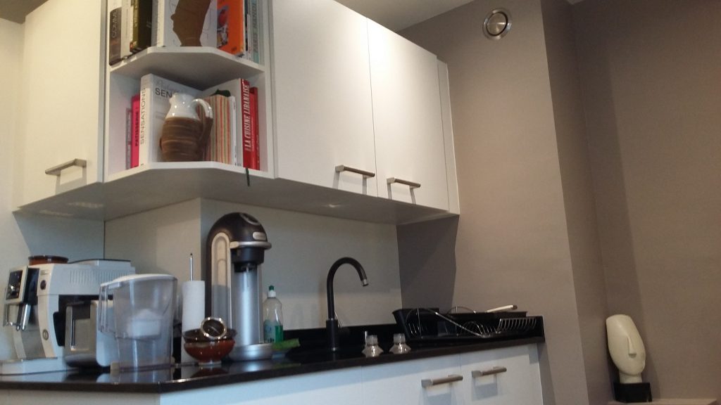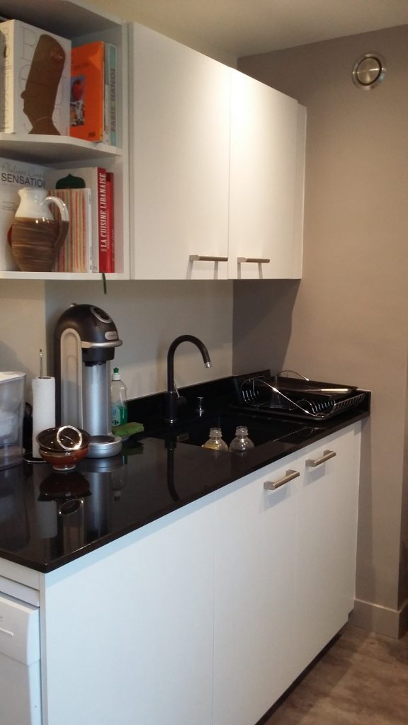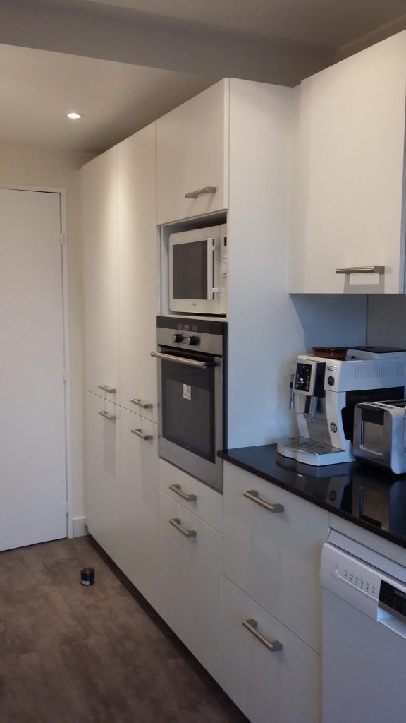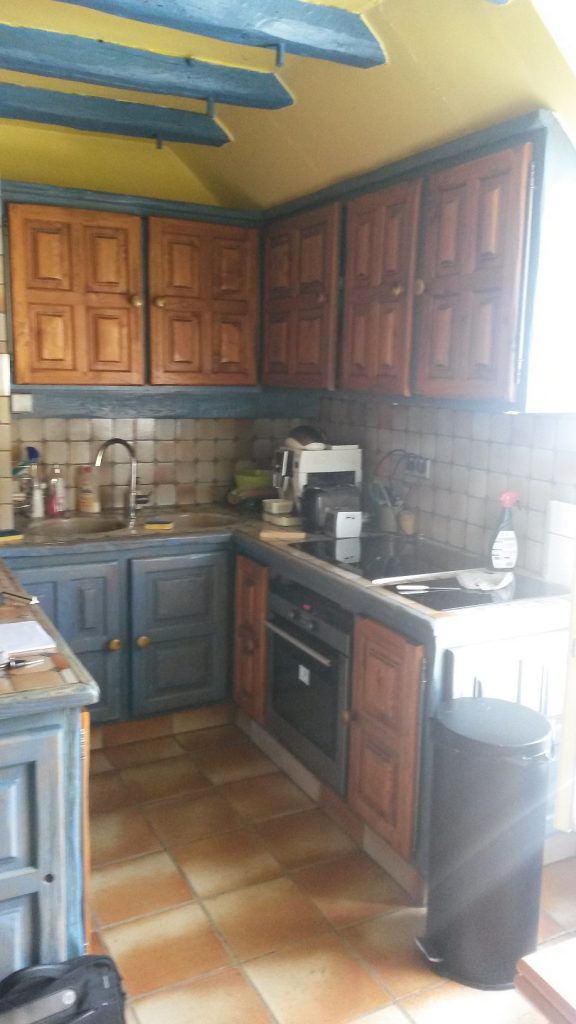 La cuisine a été entièrement rénovée, le carrelage en terre cuite a été recouvert par des dalles clipsées “ardoisées” présentant l’avantage d’avoir des propriétés isolantes acoustiques. Le plafond en poutres massives a été déposé et remplacé par un plafond blanc avec des spots intégrés. L’implantation a été totalement revue pour maximiser la sensation d’espace. A Saint-Rémy-lès-Chevreuse en Octobre 2016.