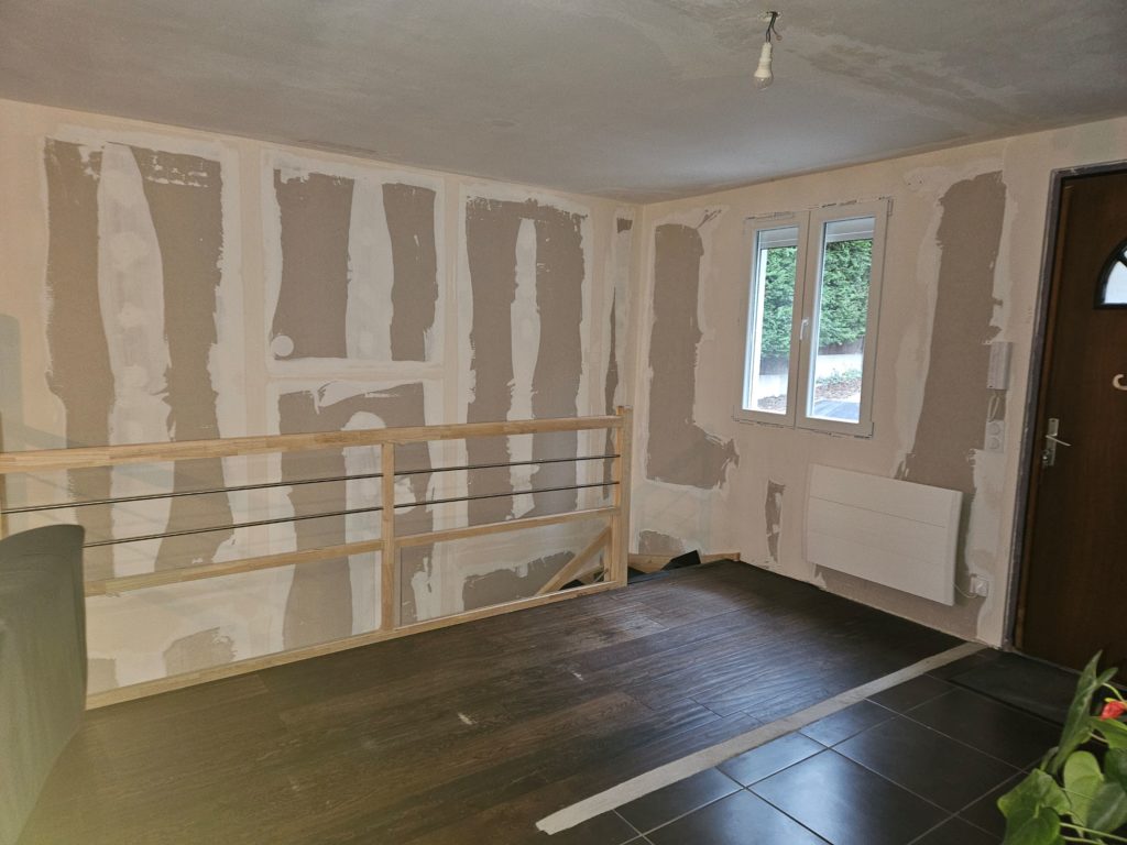 Le niveau supérieur comporte l’entrée, le salon, 3 chambres et 1 salle d’eau.