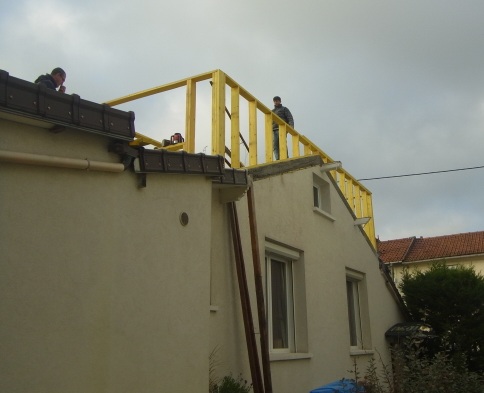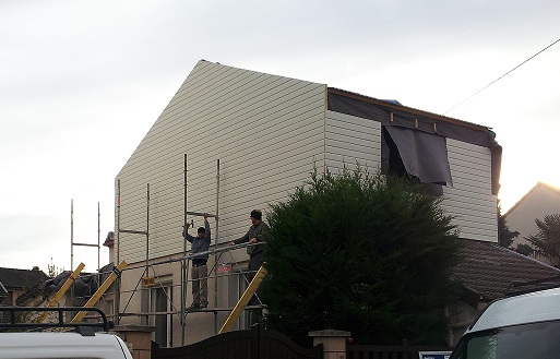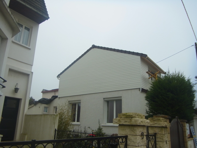 Surélévation d’un pavillon par une structure ossature bois habillée de bardage blanc, mars 2013 au Petit Clamart