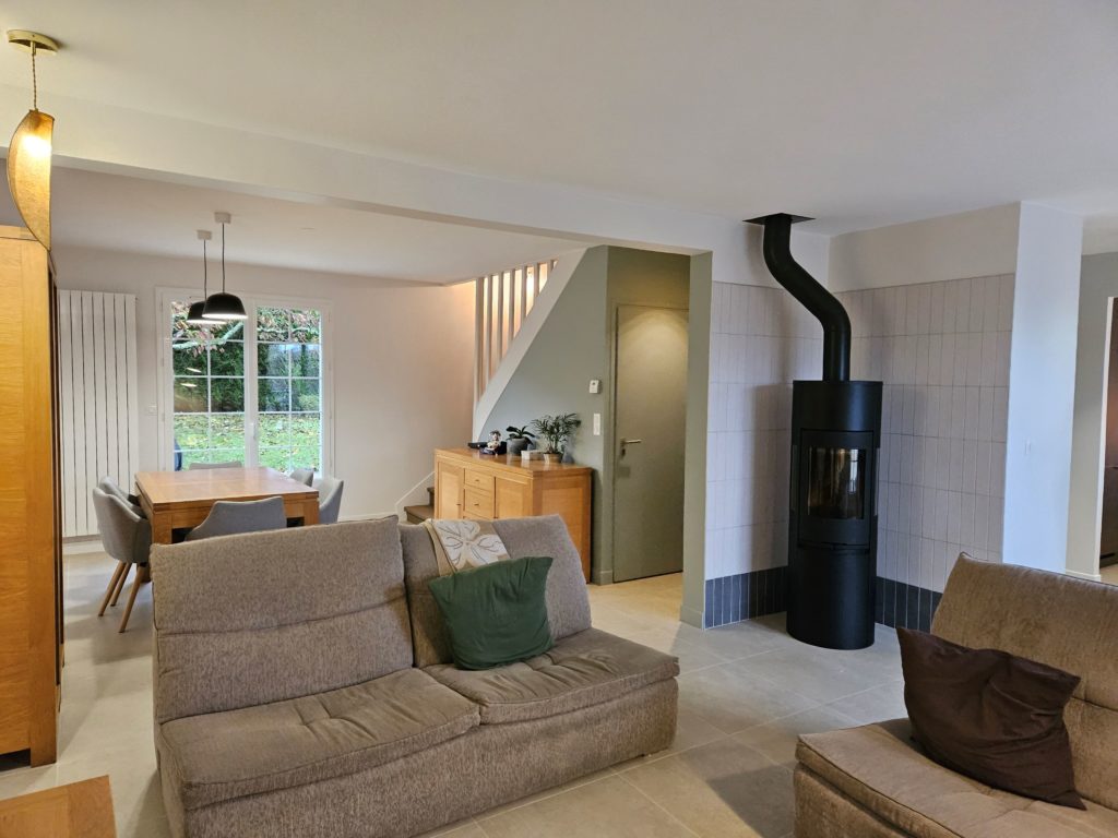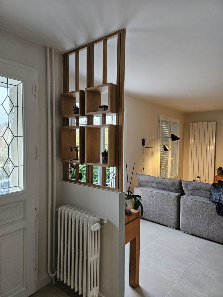 Le Rez de Chaussée de ce pavillon a été restructuré, décoré pour pouvoir s’adapter aux besoins de ses habitants. La cuisine, l’entrée et le séjour ont été décloisonnés. En jouant avec, des placards, des étagères, une verriere et un claustra, chaque espace conserve sa fonction, mais la communication est métamorphosée. Ce projet a été imaginé en collaboration avec Sophie Rodrigues Décoratrice à Vayres sur Essonne. Au troisième trimestre 2023 à Ollainville.