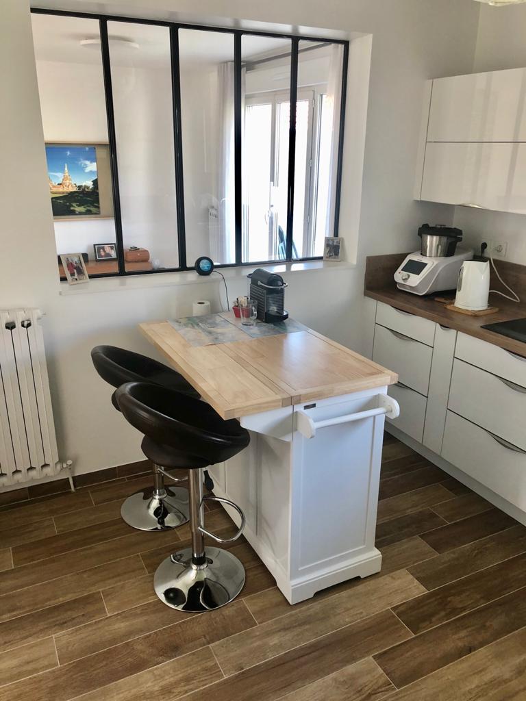En ajoutant cette grande verrière et la porte d’atelier, nous avons amélioré la luminosité, bénéficié de la lumière traversante et facilité la communication tout en conservant à la cuisine son indépendance.