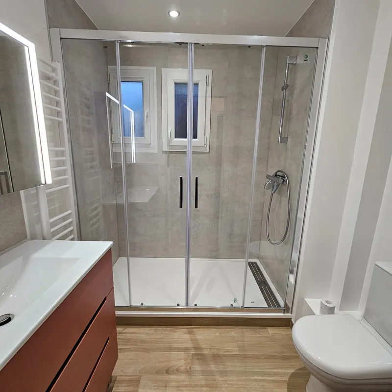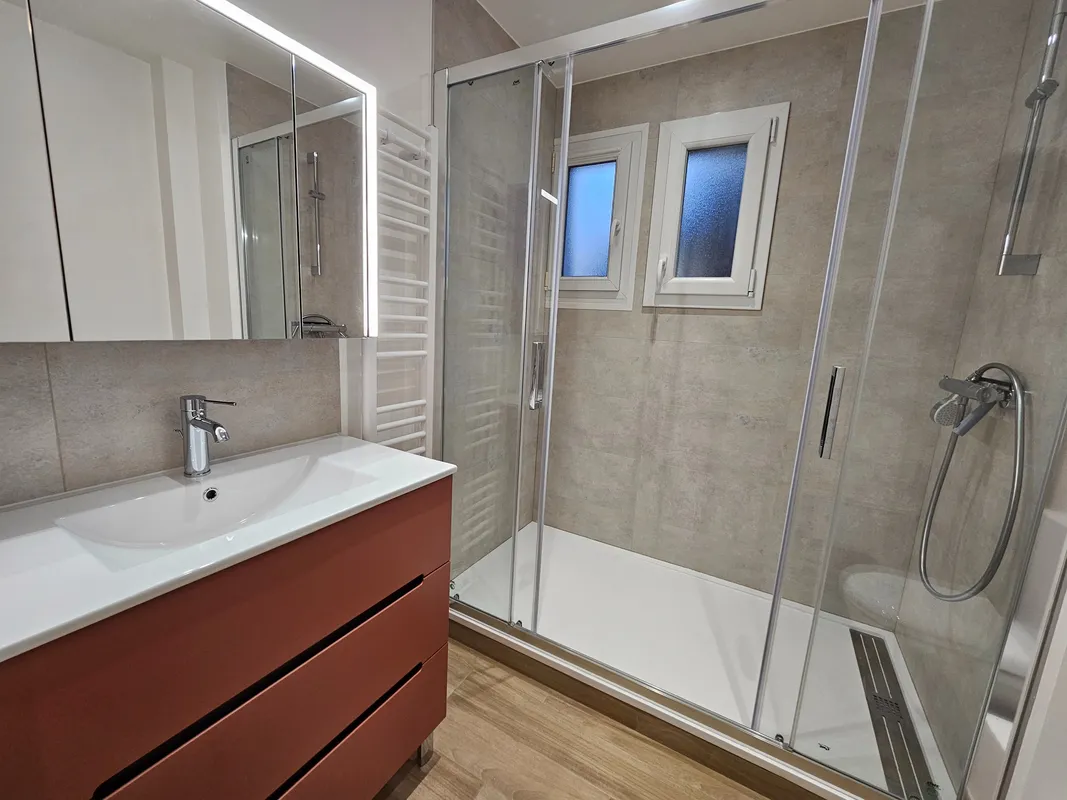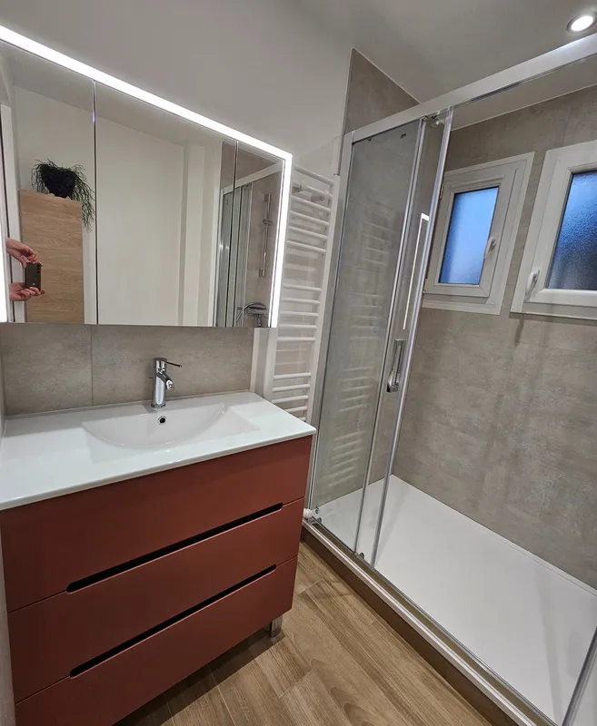 L’ancien bac de douche a été remplacé, permettant d’y accéder sans encombre. Une paroi de douche coulissante à ouverture centrale et un receveur extra-plat répondent à tous les critères de confort et de sécurité : un large accès, une liberté de mouvement et un design moderne.