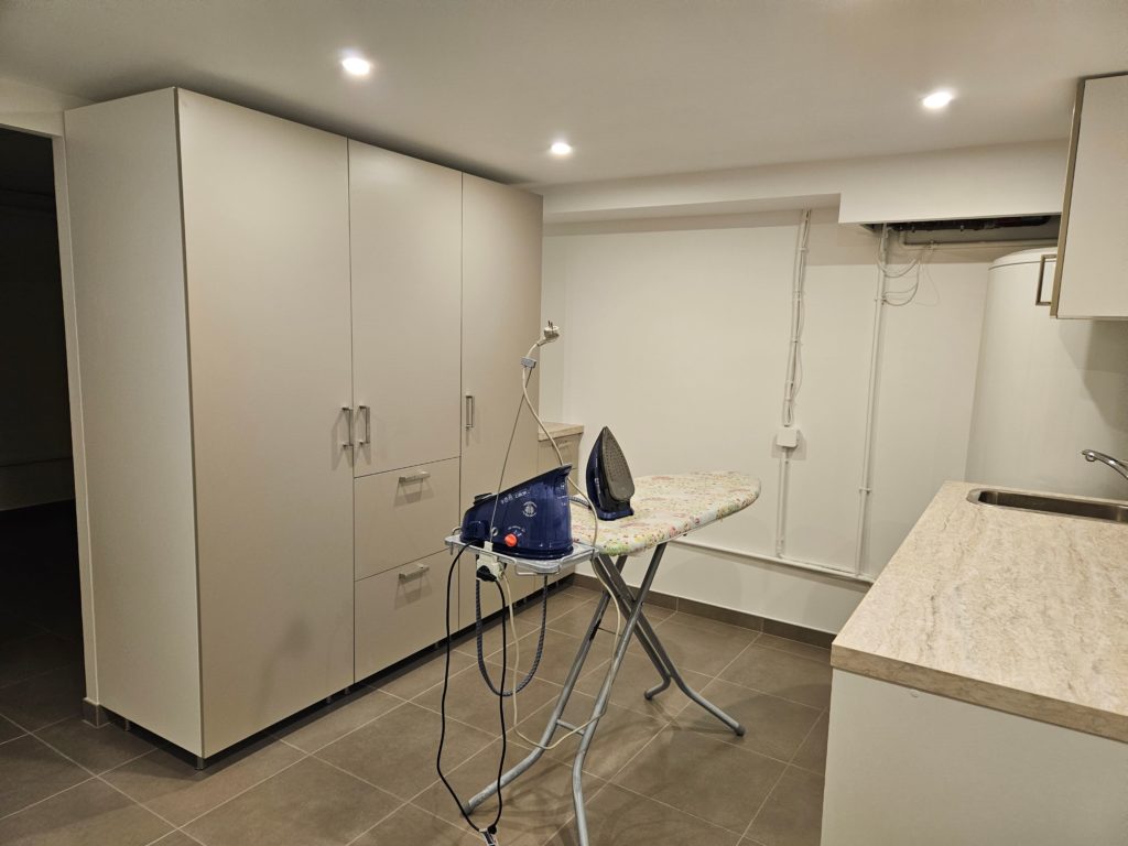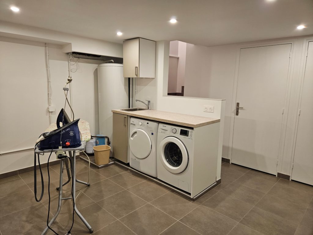 Les sous-sol de ce pavillon a été totalement transformé. Initialement c’était un garage avec une partie consacrée au stockage. Cette zone a été restructurée. Après travaux elle permet d’accueillir : une buanderie, des rangements, une très belle cave à vin et bien sur une petite zone de stockage. L’ensemble du local a été isolé, carrelé et peint.