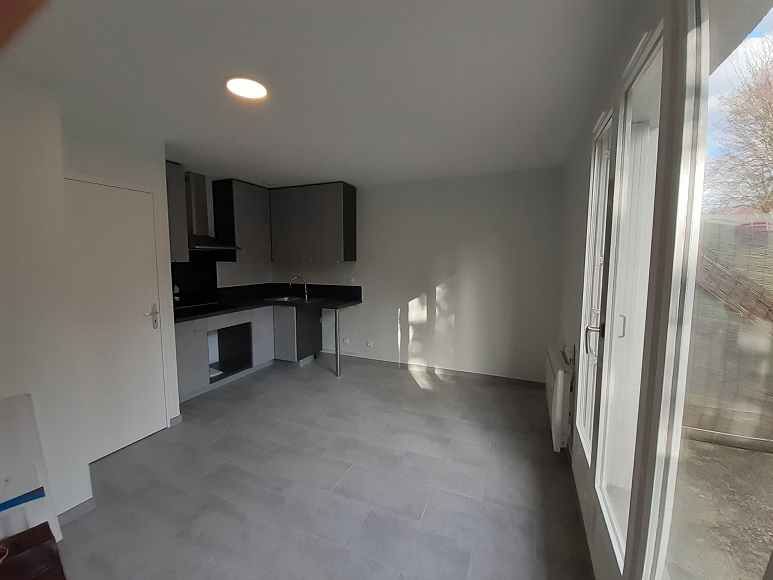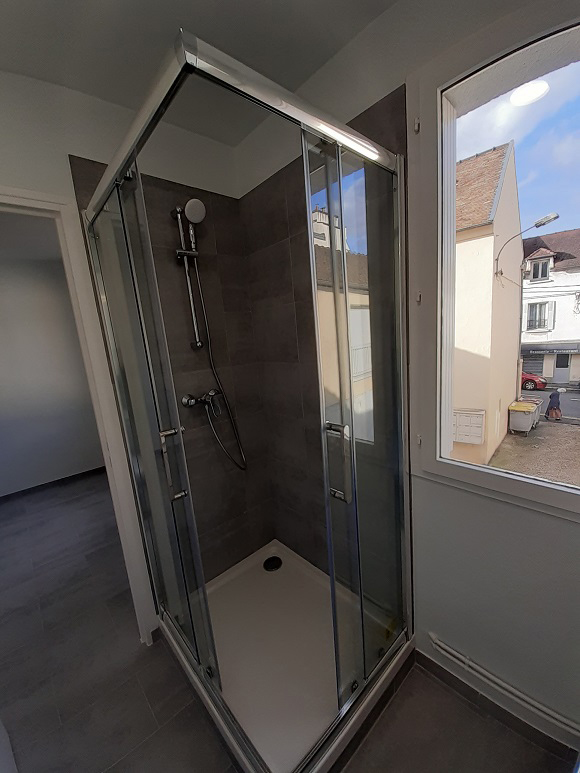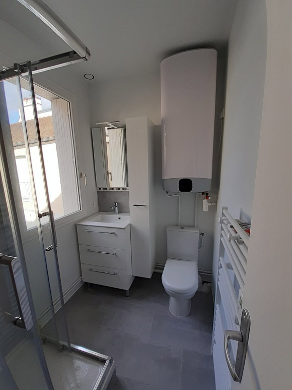 La cuisine a trouvé sa place dans la piece à vivre orientée plein sud et vers le jardin. La salle d‘eau, simple et efficace, est équipée d’une grande douche de 80×100 cm.