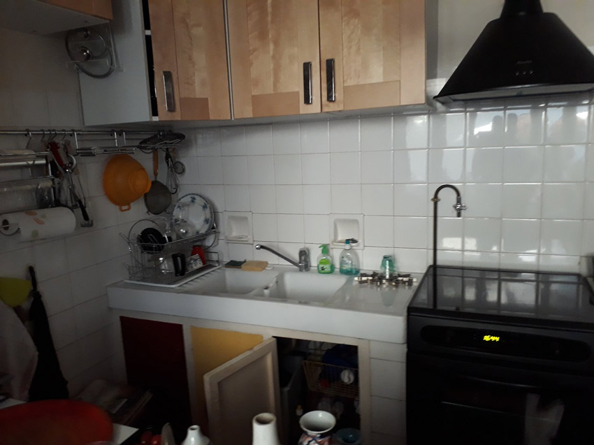 La cuisine a été repensée, rénovée et remplacée en alliant la sobriété du bois blanchi et de l’inox avec la couleur pour un look intemporel à Montreuil en juillet 2018.